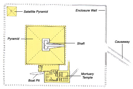 The royal pyramid stood almost in the centre of the complex. The pyramids of Djedefre's predecessors Snofru and Kheops had the burial chamber inside the pyramid above ground level. For unknown reasons, Djedefre prefered to have his burial chamber, built at the bottom of a collossal pit measuring 23 by 10 metres and sunk some 20 metres into the ground. The burial chamber itself measured 21 by 9 metres. This technique was also used for the building of the burial chamber of Netjerikhet at Saqqara. A 49 metre long corridor slopes up to ground level, providning the entrance to the pyramid. As was already traditional, this entrance was located in the North, pointing to the circumpolar stars. There was a smaller satellite pyramid built to the